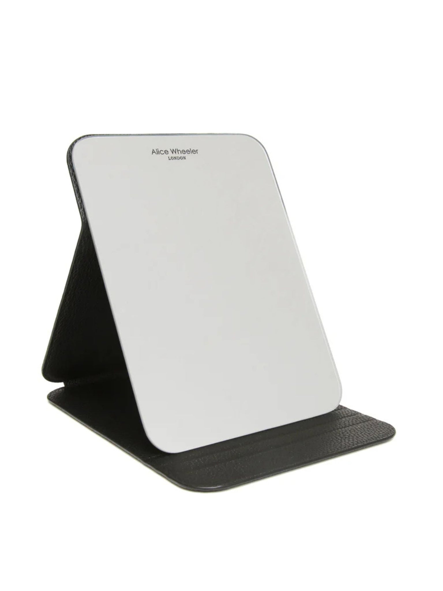 ALICE WHEELER AW0304 black folding travel mirror with frameless design, protective case and stand, 15 × 20 cm size.