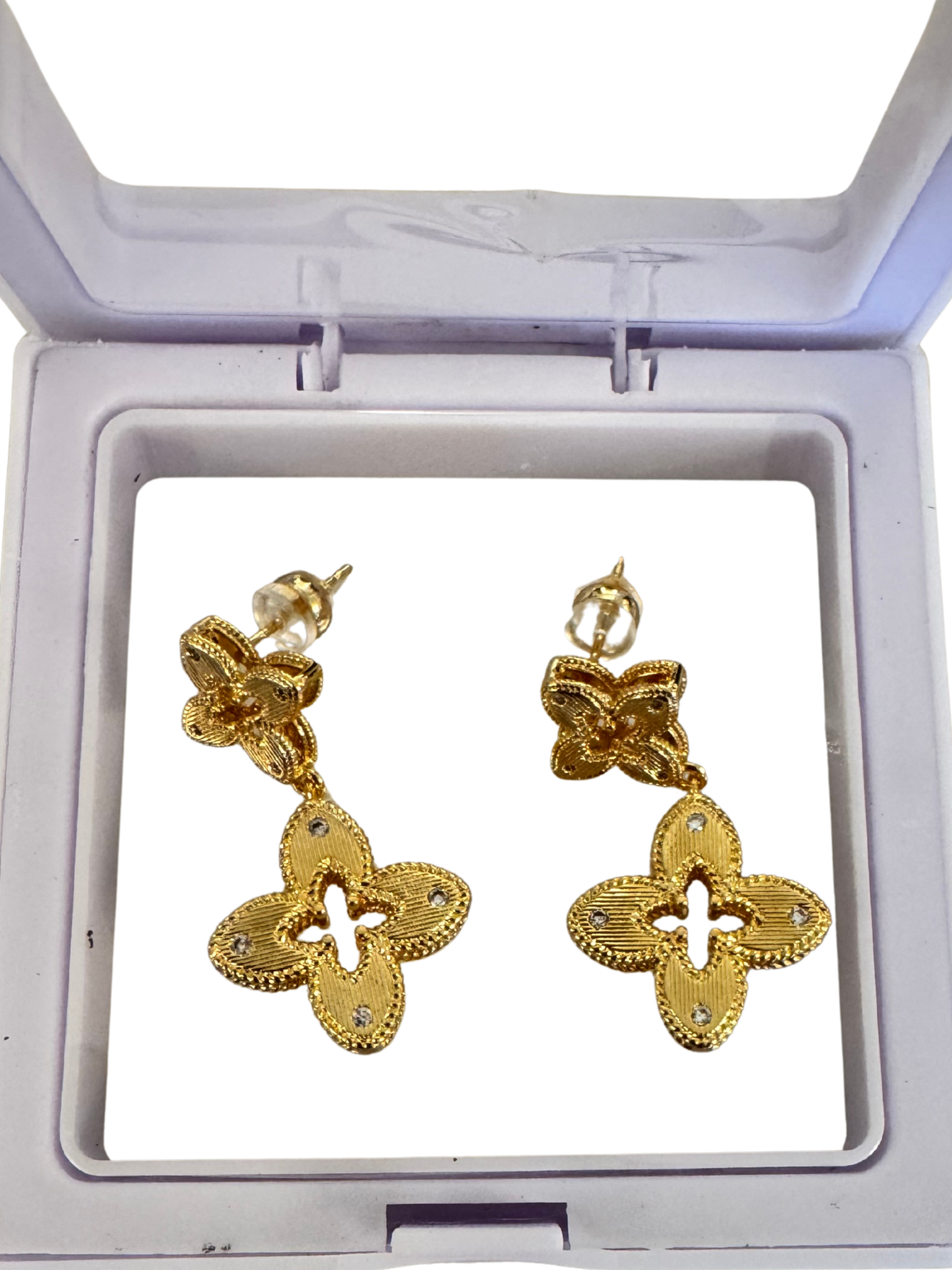 • Load image into Gallery viewer, PCHA EUR574 Gold Four Petals Charm Drop Earrings featuring floral-inspired design, crystal accents and elegant gold detailing.