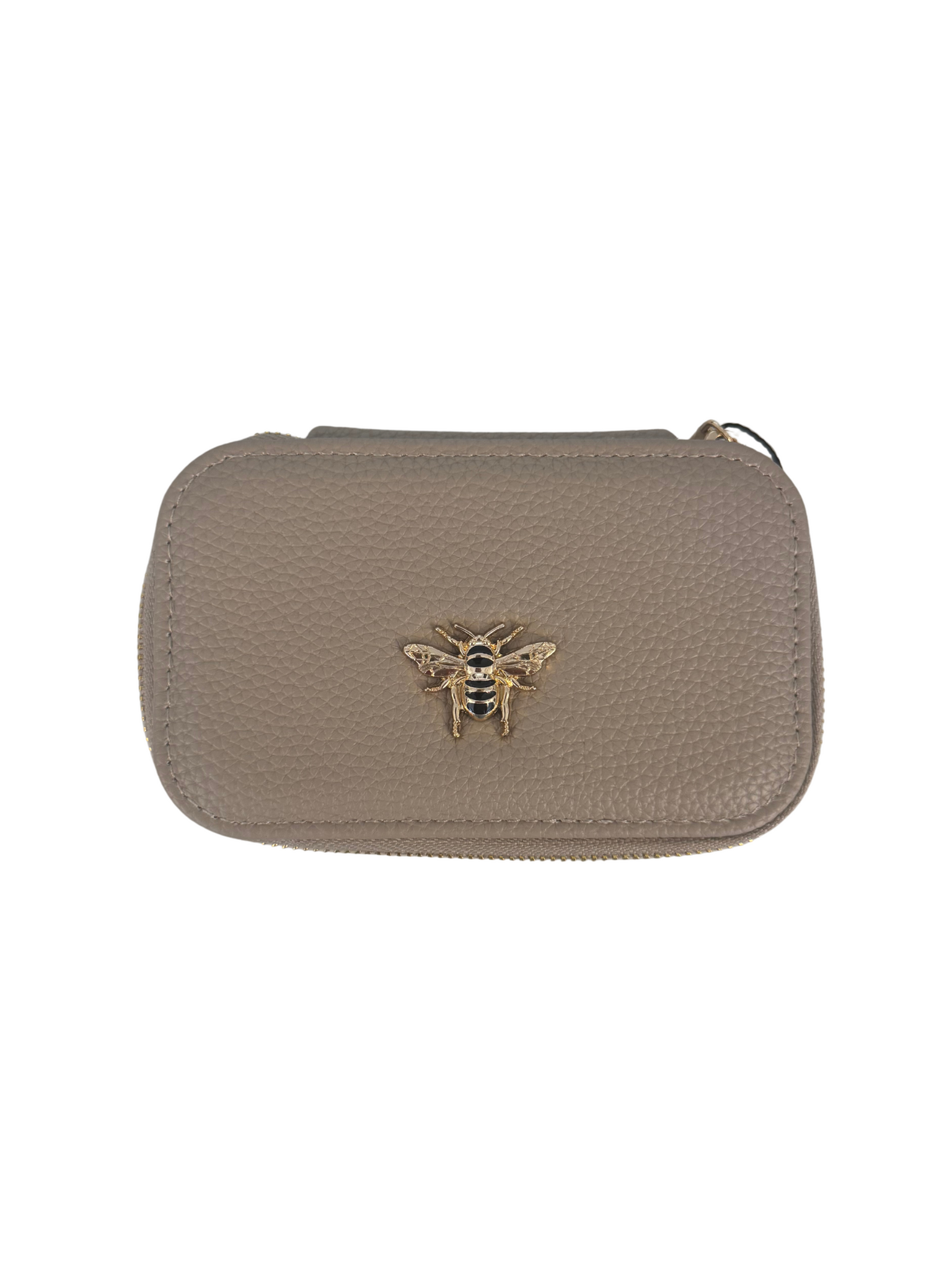 Alice Wheeler AW5950 Stone Mini Jewellery Box with gold bee emblem – compact travel jewellery organiser with zip closure, ring rolls and storage compartment.