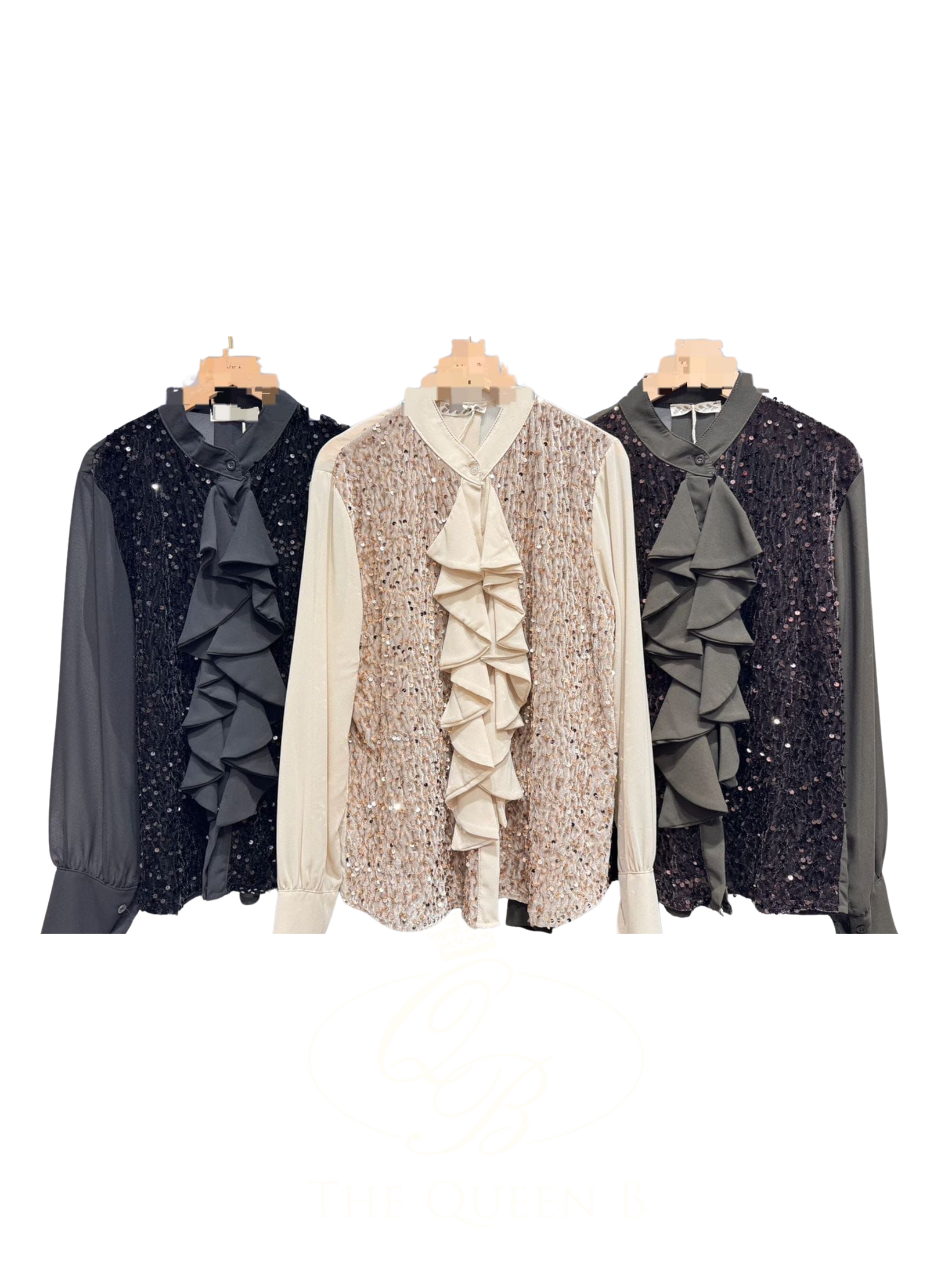 QBAW25 BC Cream Floss Blouse featuring sequin embellishment, long chiffon sleeves and cascading ruffle detailing.