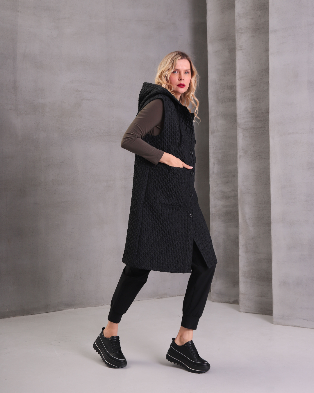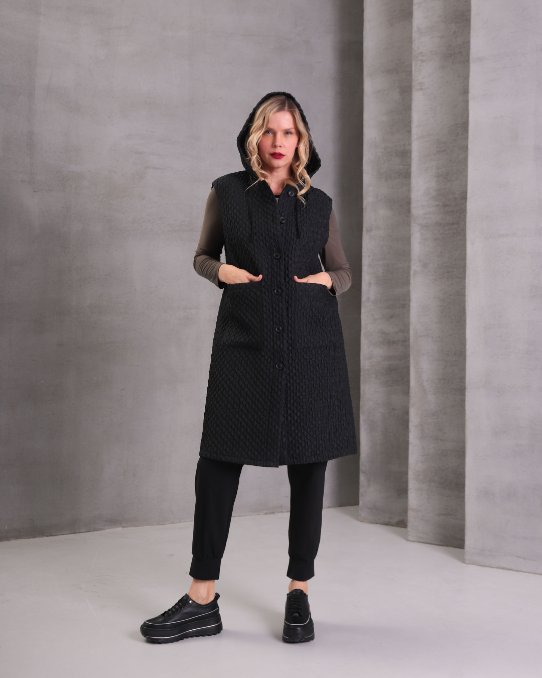 Stay warm in style with the INCO longline quilted coat, a must-have for autumn and winter layering. Featuring a sleeveless design, statement hood and button-front closure, this coat offers a modern twist on classic outerwear. The textured quilted finish adds both warmth and elegance, making it perfect for smart casual dressing, outdoor walks and everyday chic.