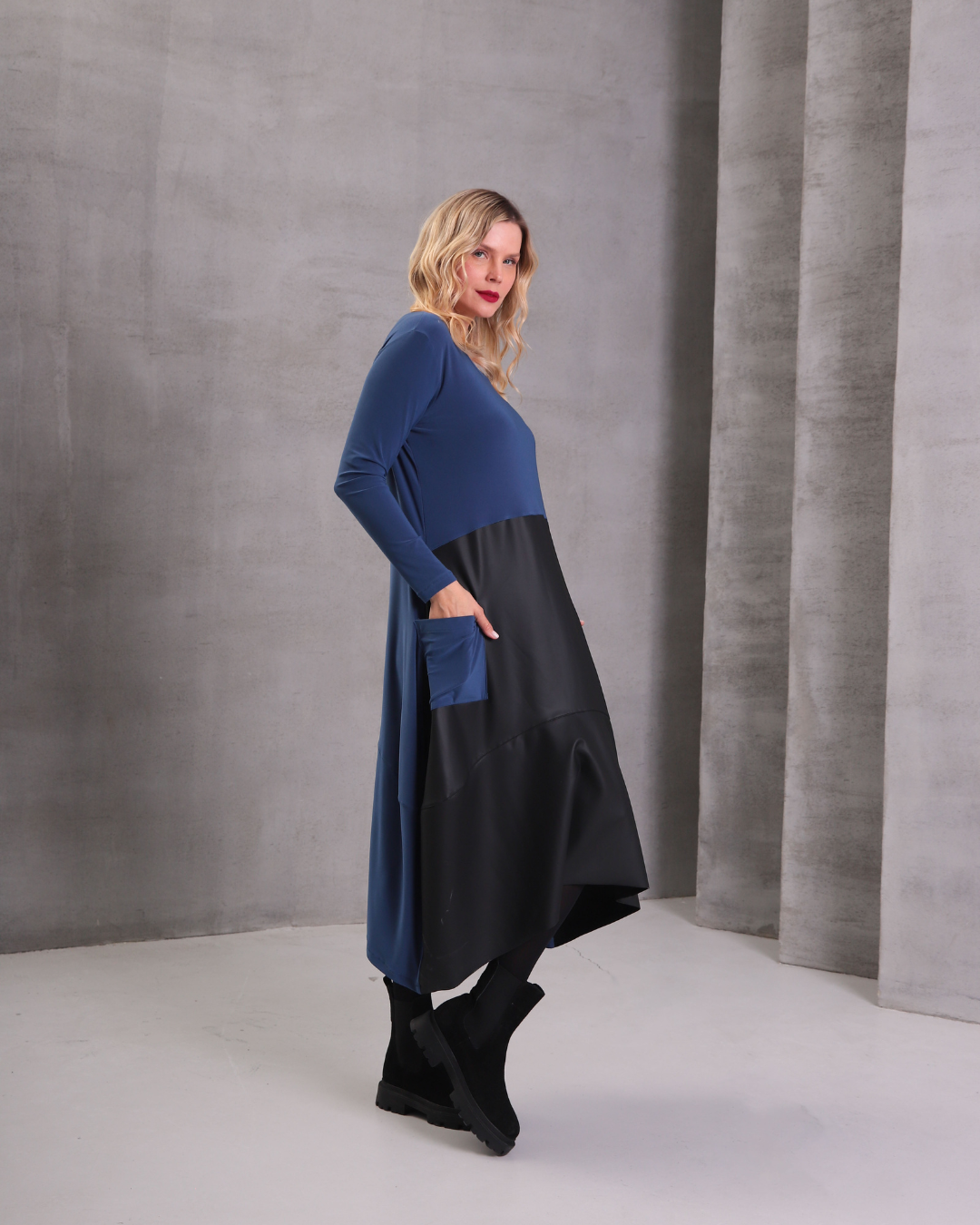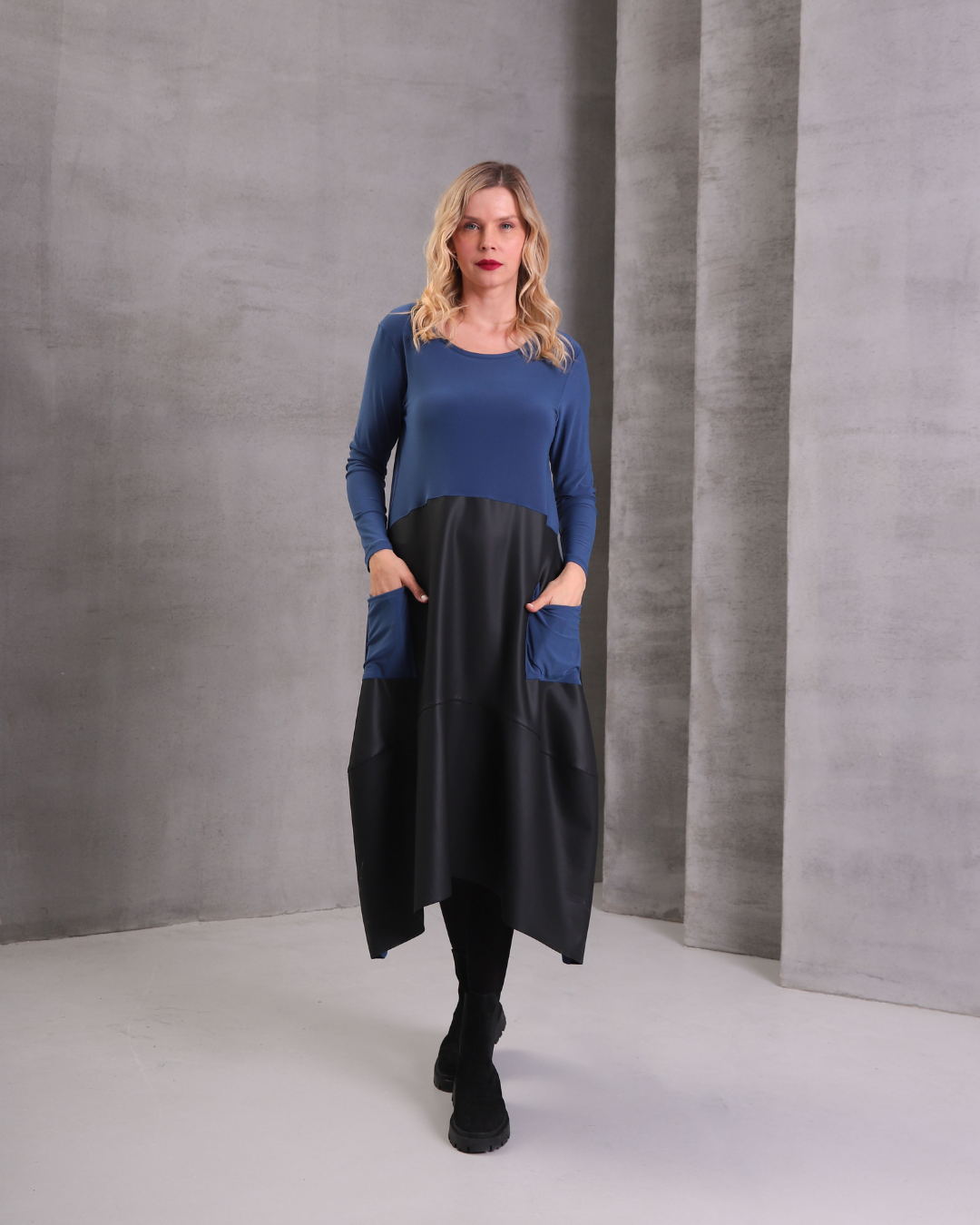 Stand out in the INCO two-tone midi dress, featuring a navy jersey bodice and a sleek black faux leather skirt. Designed with an asymmetric hem, contrast pockets and long sleeves, this chic dress is perfect for day-to-night styling. Pair with boots or heels for an effortless, fashion-forward look.