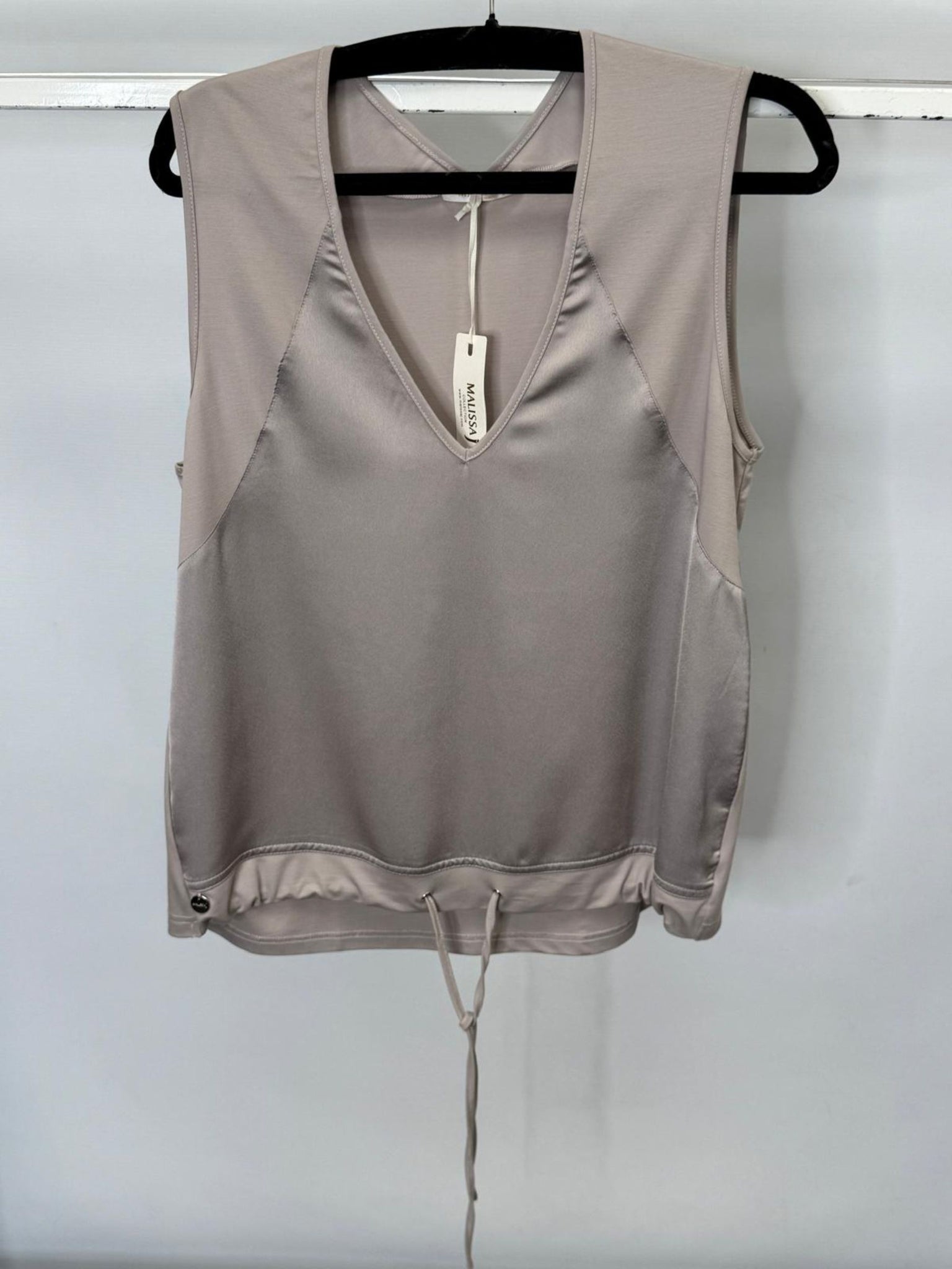 Beige tank top with a tag on a hanger against a white background