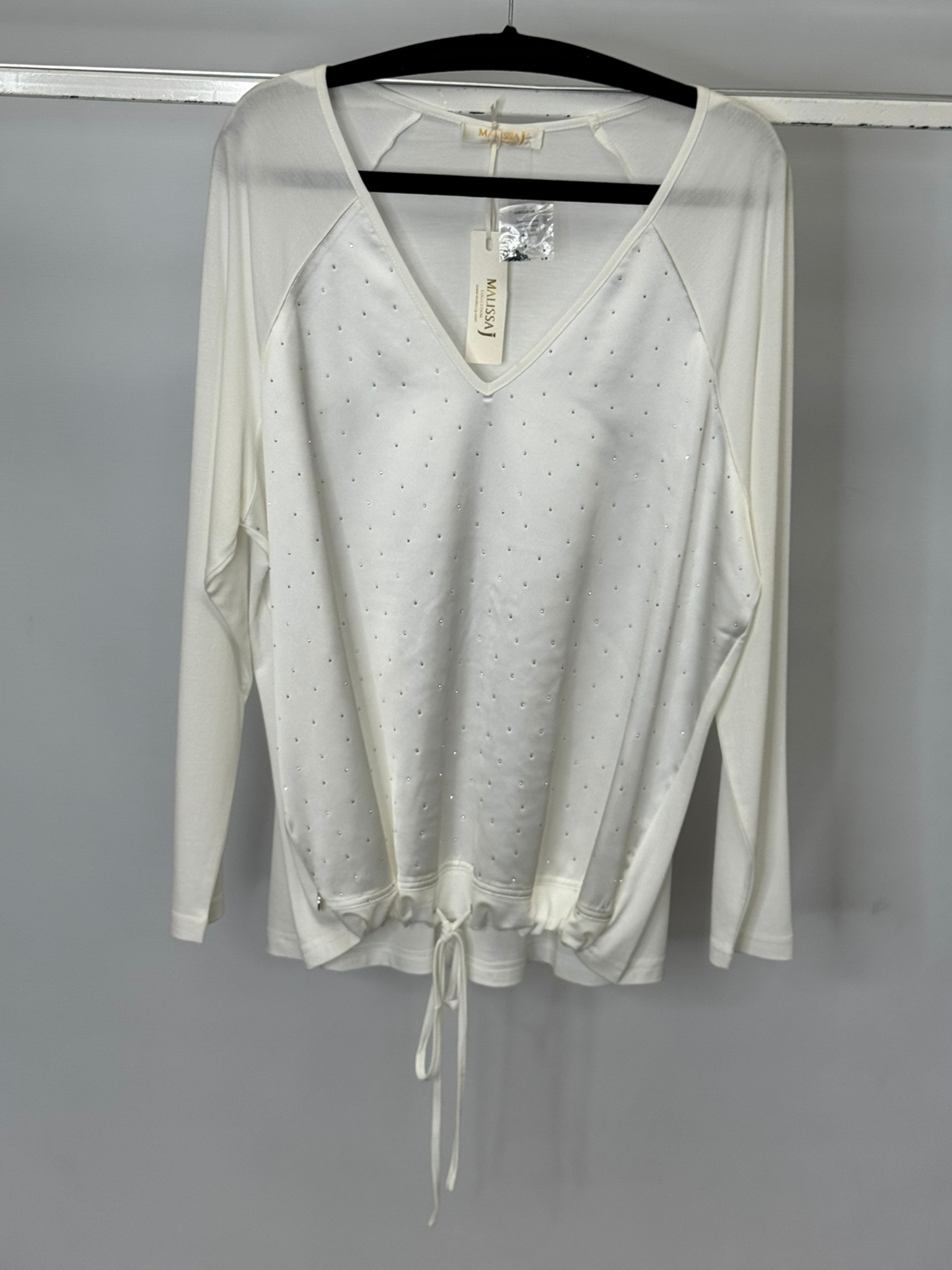 Refresh your wardrobe with the Malissa J WF2605 White/Silver Studded Top, a chic and versatile piece perfect for both casual and evening looks. Crafted in a soft white fabric and embellished with subtle silver studs, this women’s top brings a touch of sparkle without being overpowering. The flattering V-neckline and drawstring hem create a modern silhouette, making it an elegant yet comfortable choice for day-to-night wear.