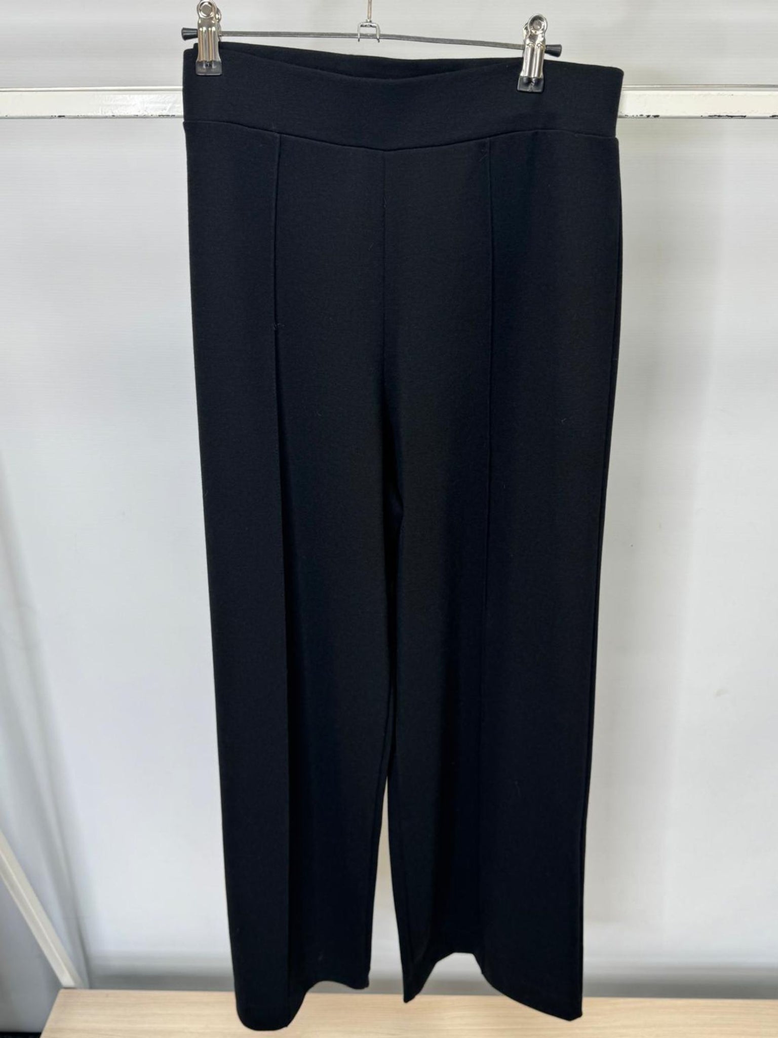 Black Wide Leg Ponte Trousers are the ultimate blend of comfort, style and versatility. Designed in a flattering wide-leg silhouette, these pull-on trousers feature a smooth elasticated waistband for effortless wear and a front seam detail that elongates the leg for a sleek, tailored look. Crafted from a premium ponte fabric, they offer a perfect balance of stretch and structure, making them ideal for both casual and smart occasions.