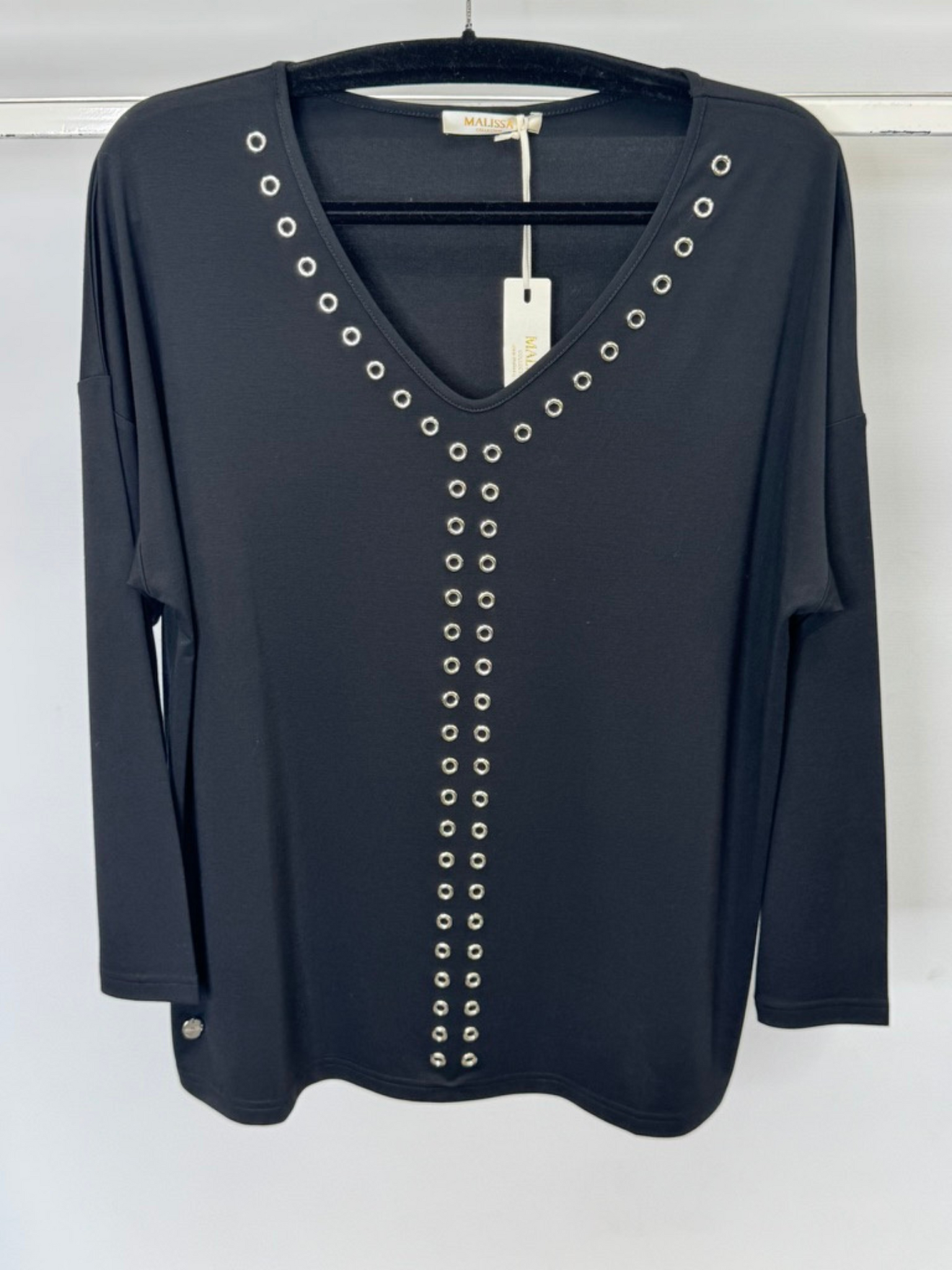 Upgrade your wardrobe with the Malissa J WF2566 Black Long Sleeve Top, a versatile piece that blends comfort with contemporary style. Designed in classic black, this women’s top features striking silver eyelet stud embellishments along the V-neckline and centre front for a bold, modern finish. With its relaxed fit and long sleeves, this top is perfect for creating chic day-to-night looks with ease.