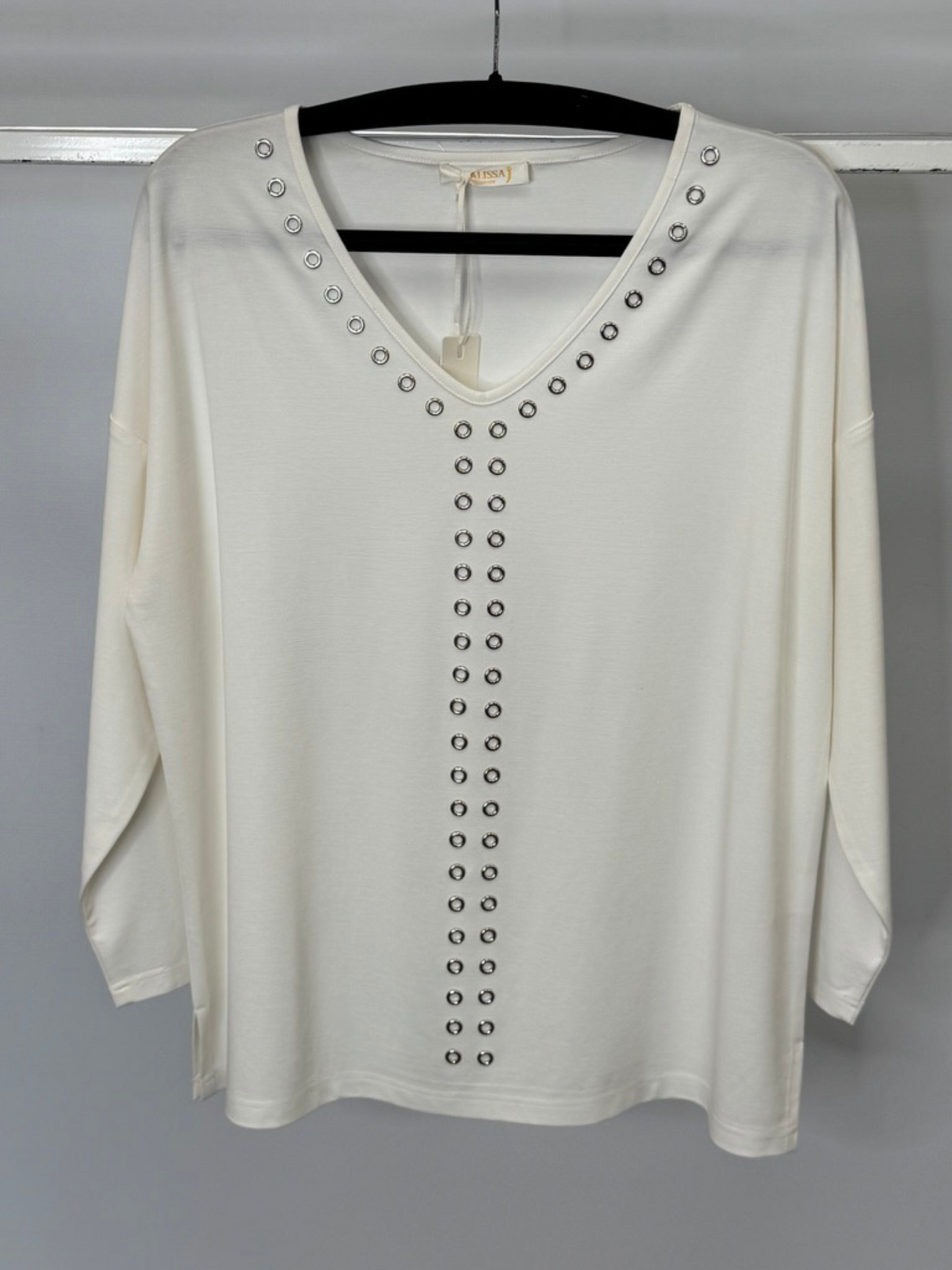 Upgrade your wardrobe with the Malissa J WF2566 White Long Sleeve Top, a versatile piece that blends comfort with contemporary style. Designed in classic white, this women’s top features striking silver eyelet stud embellishments along the V-neckline and centre front for a bold, modern finish. With its relaxed fit and long sleeves, this top is perfect for creating chic day-to-night looks with ease.
