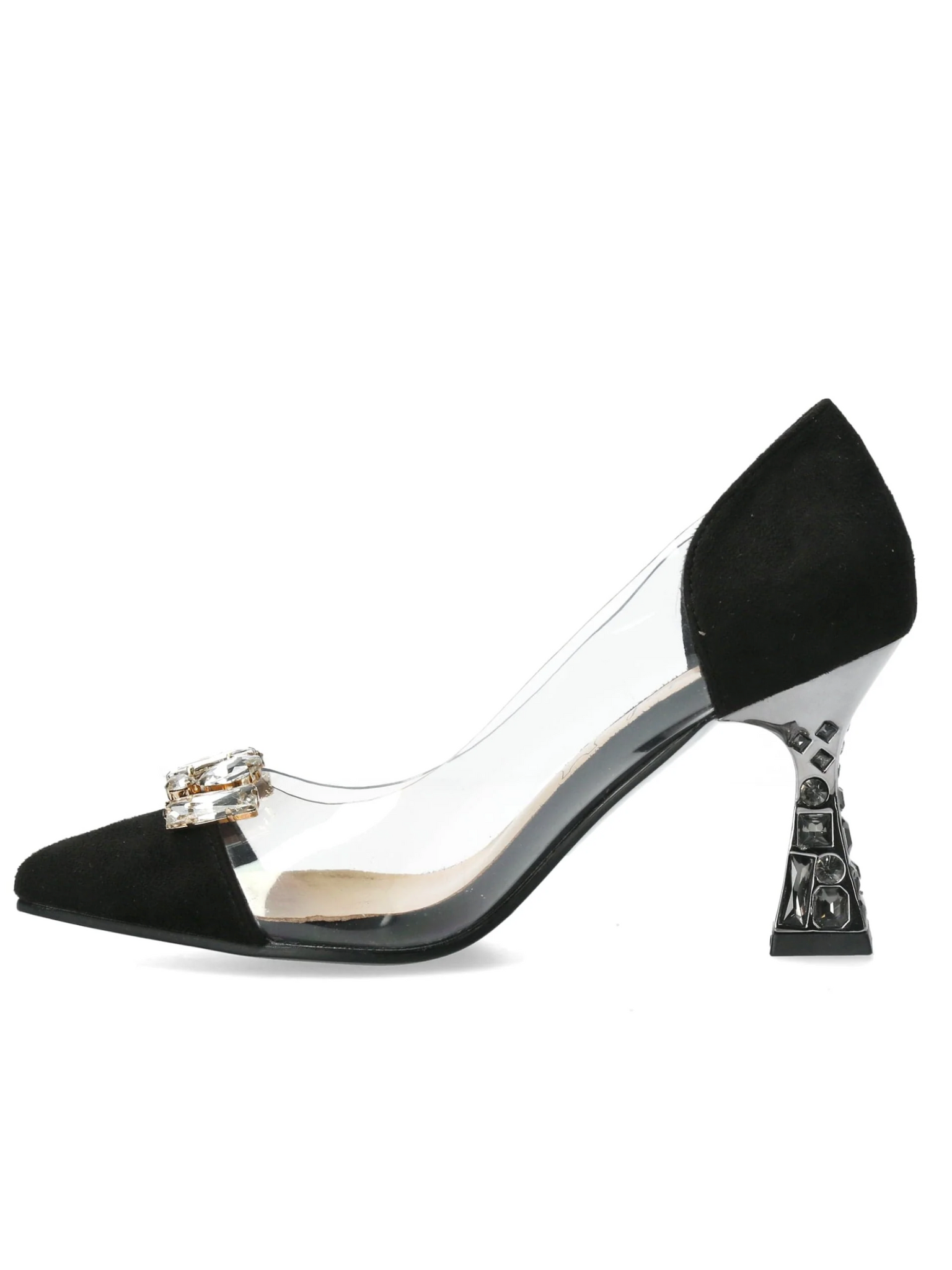 Step out in elegance with the Misstyl Myriano 06 Noir Heel, a statement stiletto designed to bring sophistication to every step. Combining modern glamour with timeless detail, this heel features a sleek pointed toe with jewel embellishment, a clear TPU upper with black textile accents and a sculpted crystal-detailed stiletto heel for a unique finish. The cushioned leather insole ensures comfort, while the 7.5 cm heel height offers just the right amount of lift for both evening and occasion wear.