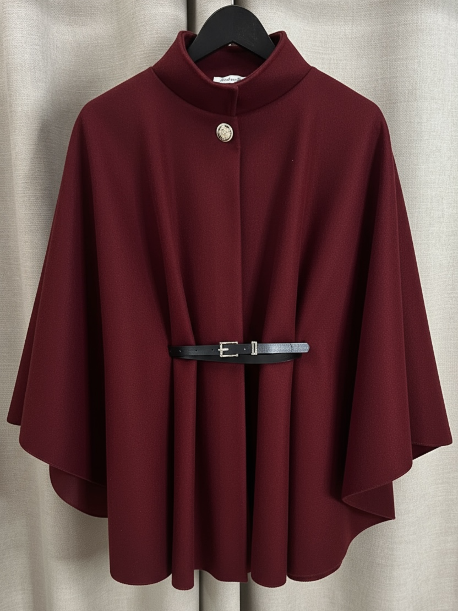 • Elegant structured cape with high neckline and gold button fastening