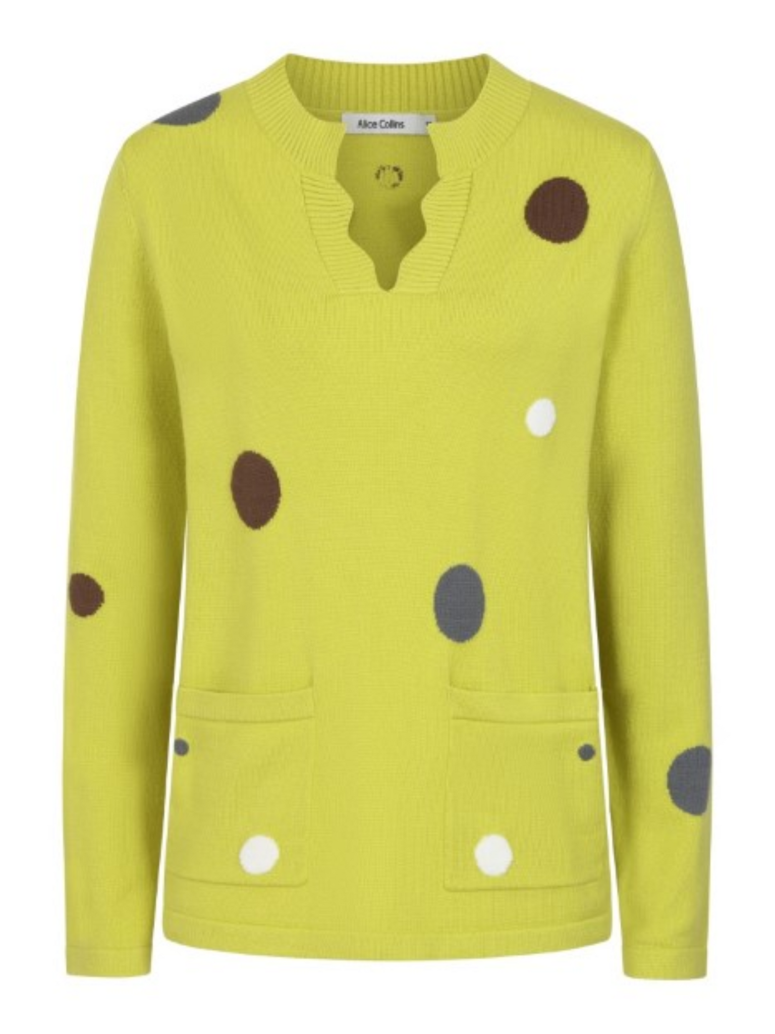 Add a playful touch to your wardrobe with the Alice Collins Citronelle Polly Polka Dot Pullover – a cosy yet stylish essential for cooler days. Featuring a flattering notched neckline and statement multicoloured polka dots, this soft women’s jumper brings charm and comfort to any casual outfit. With two front patch pockets and a relaxed fit, it’s perfect for everyday layering in autumn and winter.