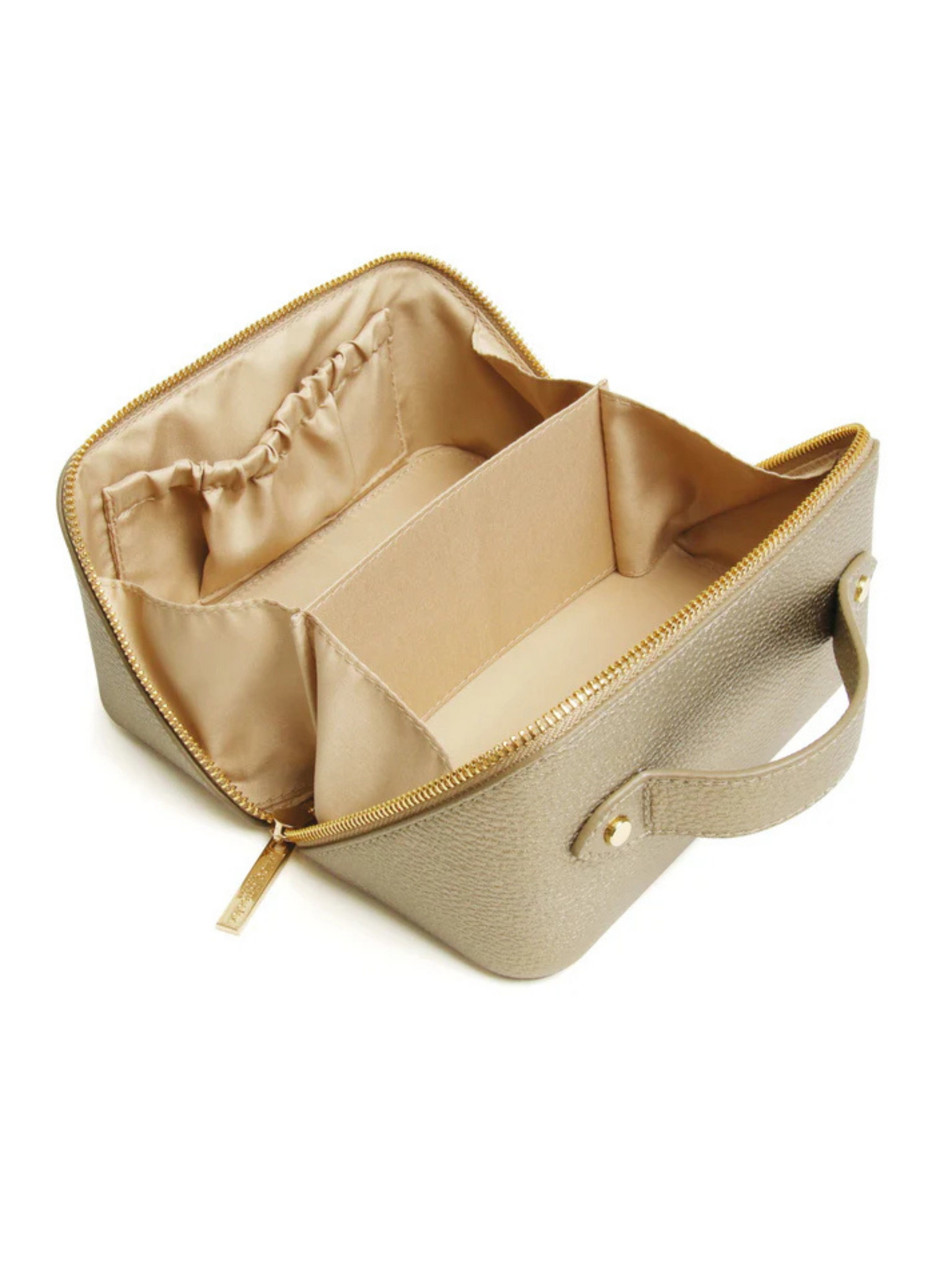 • Sleek compact train case design in classic bronze